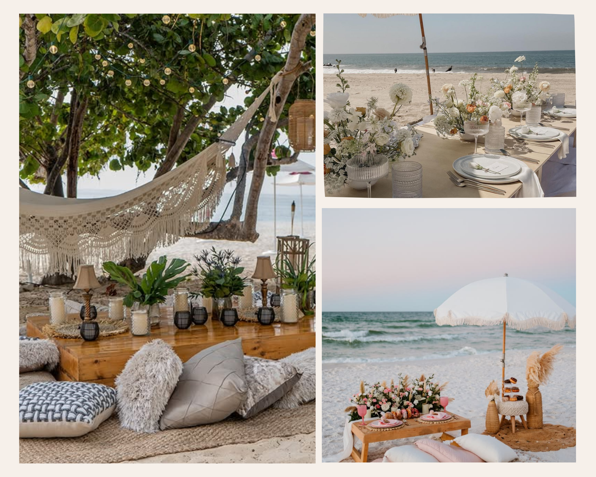There is nothing quite like a luxe picnic on the sand. We ditch the plastic chairs for a low-profile wooden table, cozy floor cushions, and a setup that feels both high-end and totally relaxed — the ultimate island life experience. Includes a low-profile picnic table, comfortable floor cushions and rugs, curated tabletop décor, and a 20×20 welcome signage.